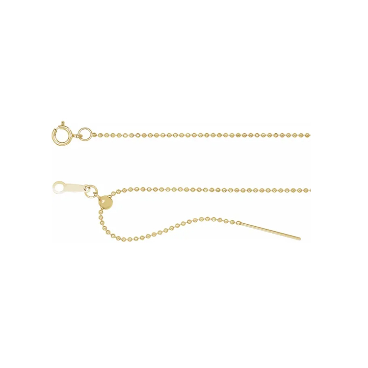 Adjustable Chain Necklace, Threader Bead Chain. Available in 14k White Gold, 14k Yellow Gold, 14k Yellow Gold Filled, Rhodium-Plated Sterling Silver and Sterling Silver. 1mm Adjustable Threader Bead 16-22″ Chain. Spring Ring Clasp.