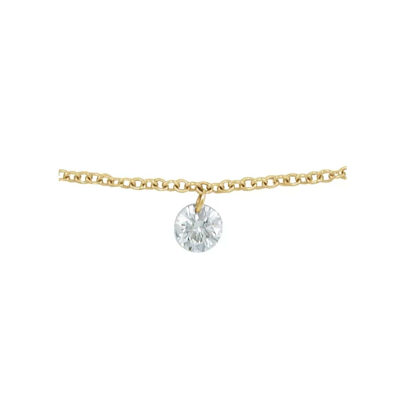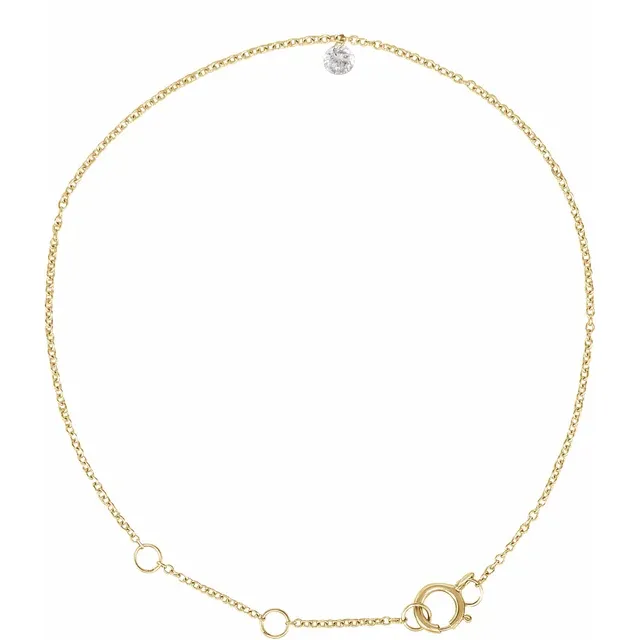 653719 – This 14K yellow gold 1/6 CT (3.5 mm) with a solitaire natural diamond anklet or ankle bracelet features a single floating, round-cut diamond, creating a minimalist and elegant look, popular Summer and beach wear. It is 9 inches in length with a polished finish and a secure Spring Ring clasp. Diamond Clarity/Color I1, G-H.