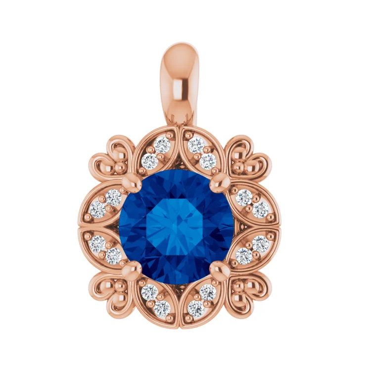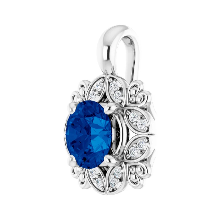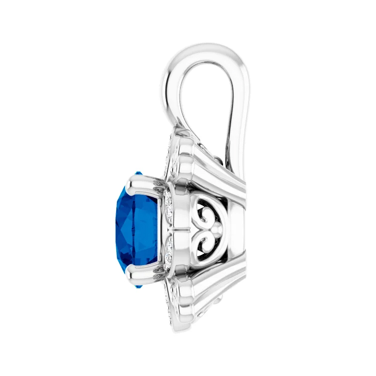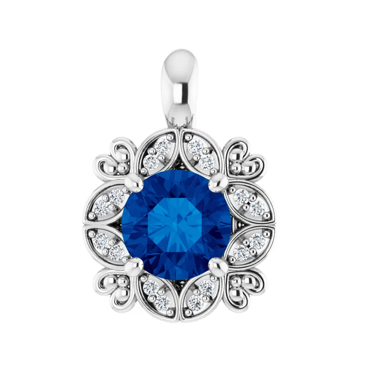 Halo-Style Diamond and Blue Sapphire Pendant. Pendant Dimensions 15 x 10.7mm. Available in 14k White Gold, 14k White Gold, 14k Yellow Gold and Platinum. Natural Blue Sapphire Size 6 mm. Natural Diamond .04 CTW. Diamond Clarity I1, Diamond Color G-H.