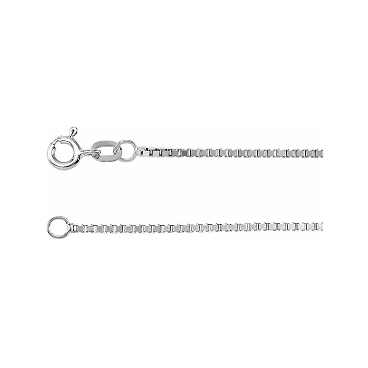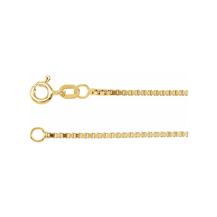 Chain Necklace, Box Diamond Cut Style. Available in 14k White Gold, 14k Yellow Gold, Sterling Silver, Rhodium-Plated Sterling Silver. Chain Width 1.3mm. Available Chain Lengths 16″, 18″, 20″, 24″.