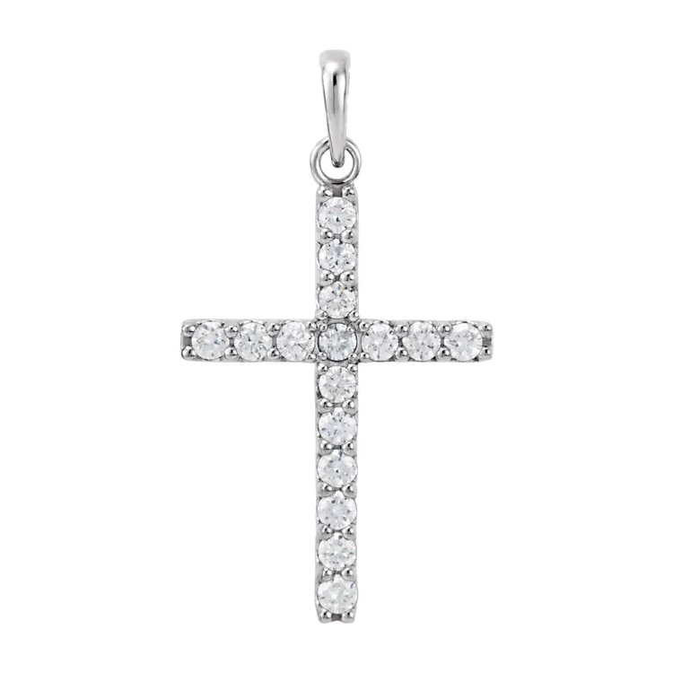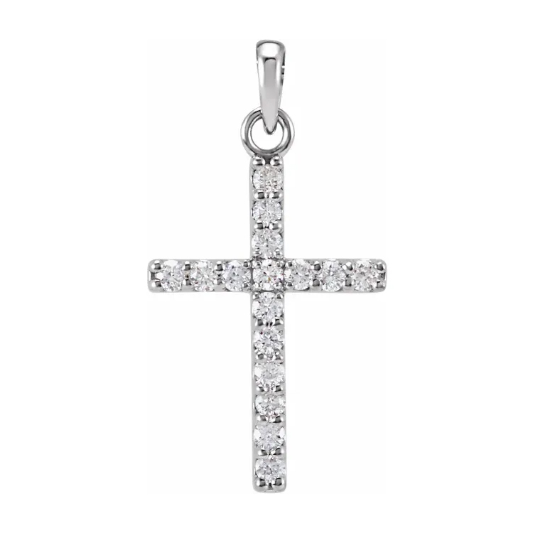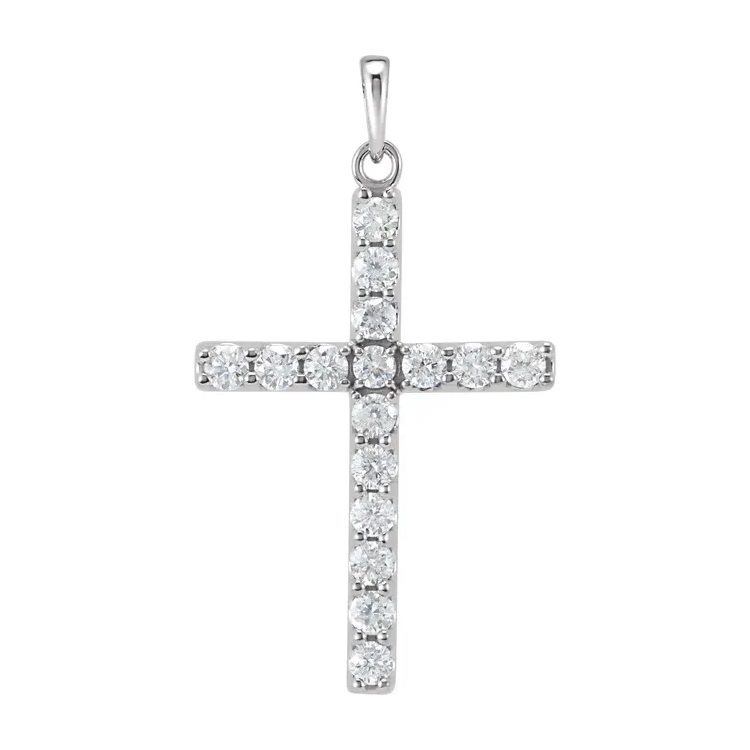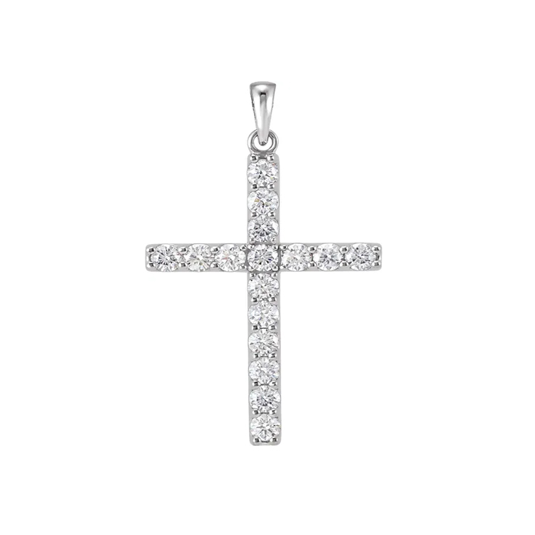 R42308 / Cross Pendant With Diamonds. Pendant Dimensions: 25.6 x 13.8 mm. Available in 14k Rose Gold, 14k White Gold, 14k Yellow Gold and Platinum. Lab-Grown Diamond or Natural Diamond. Diamond Clarity SI1-SI2. Diamond Color G-H.