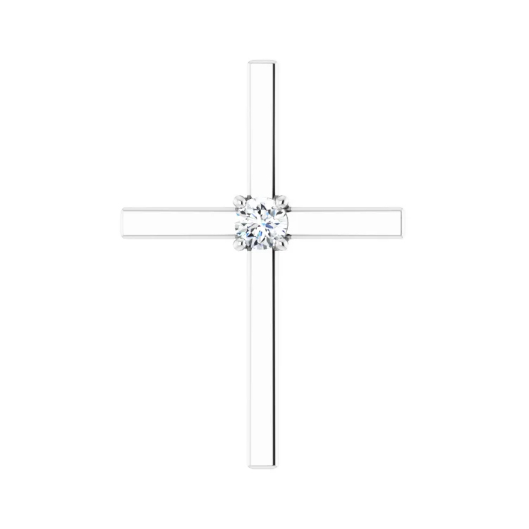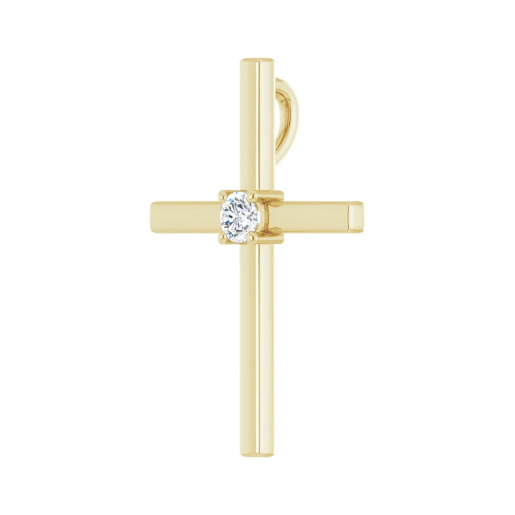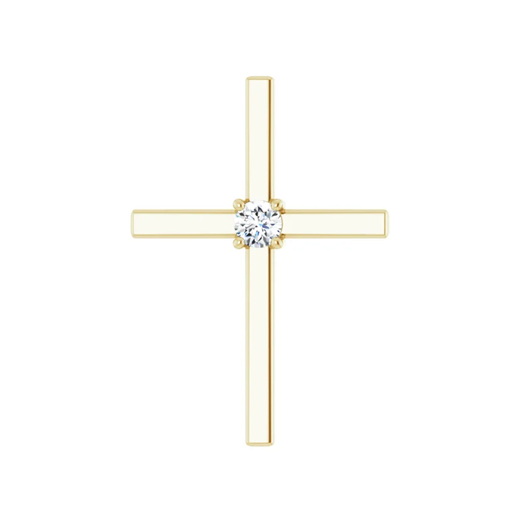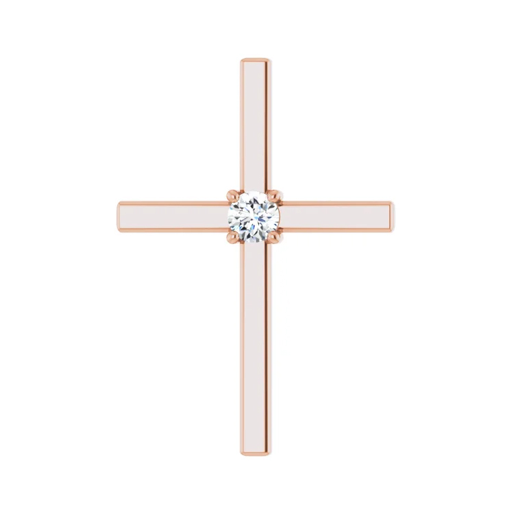 Cross Pendant With Solitaire Diamond. Pendant Dimensions 26.4 x 18.5mm. Available in 14k Rose Gold, 14k White Gold, 14k Yellow Gold and Platinum. Natural Diamond Stone Size 3.4mm, Total Diamond Carat Weight 1/6 CT. Diamond Clarity I1, Diamond Color G-H.