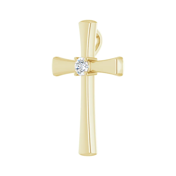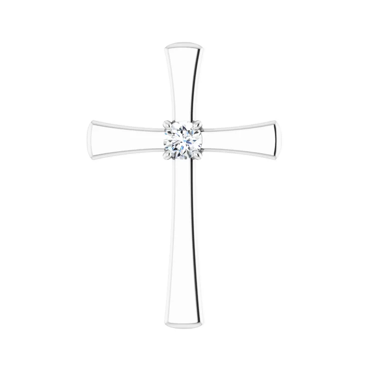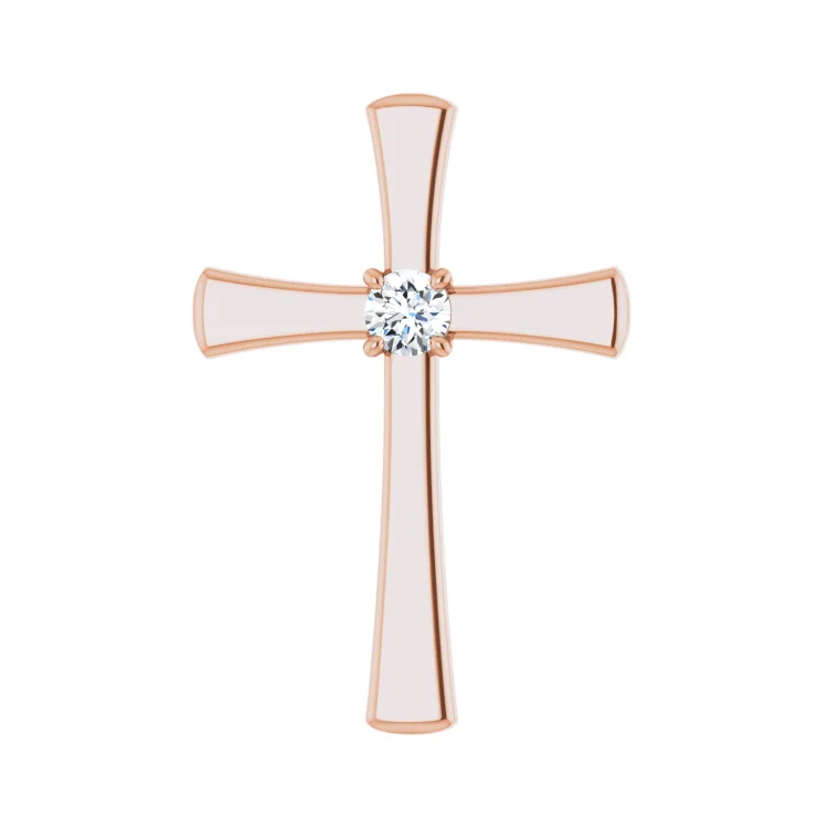 Cross Pendant With Solitaire Diamond. Pendant Dimensions 18.9 x 27.6mm. Available in 14k Rose Gold, 14k White Gold, 14k Yellow Gold and Platinum. Natural Diamond. Diamond Clarity I1, Diamond Color G-H.