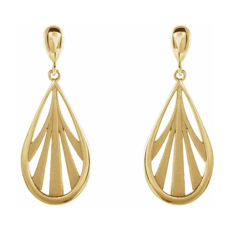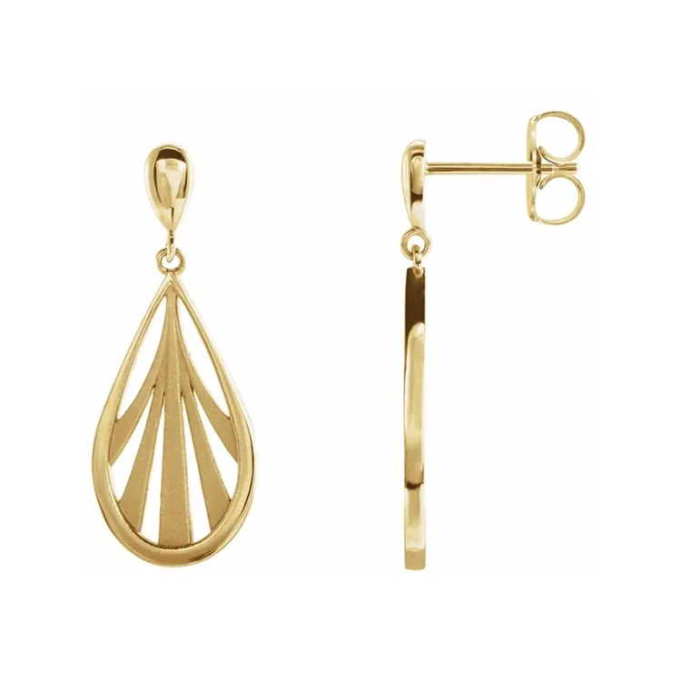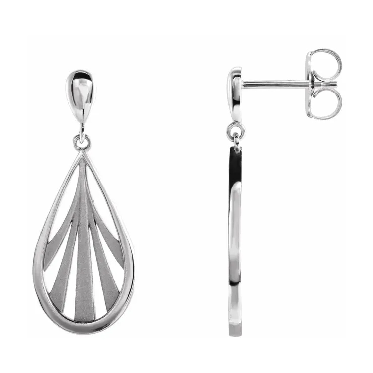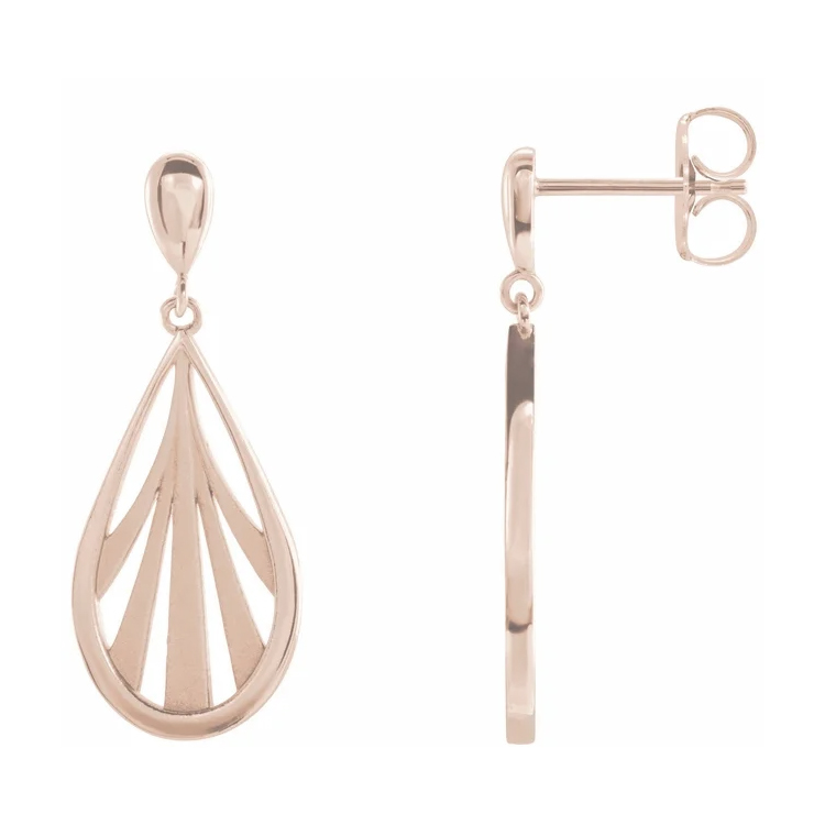 Dangle Earrings, Geometric Design. Earring Dimensions 25.2 x 9.9mm. Available in 14k Rose Gold, 14k White Gold, 14k Yellow Gold, Platinum and Sterling Silver. Friction Backs Included.