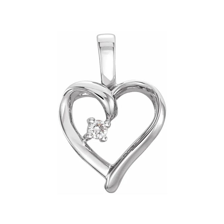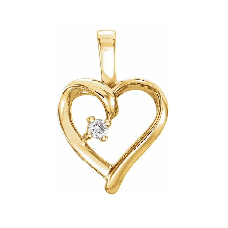 Diamond Heart Pendant. Pendant Dimensions 14.8 x 9.7mm. Available in 14k White Gold and 14K Yellow Gold. Total Diamond Carat Weight 0.02 CT. Diamond Clarity I1, Diamond Color G-H. Chain Passage Dimensions 3.4 x 1.3 mm.