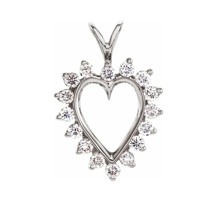 60745 / Diamond Heart Pendant. Pendant Dimensions 20.6 x 13.9 mm. Total Diamond Carat Weight 1/2 CTW. Diamond Clarity I1. Diamond Color G-H. Available in 14k White, 14K Yellow Gold. Chain Passage Dimensions 3.5×2 mm.