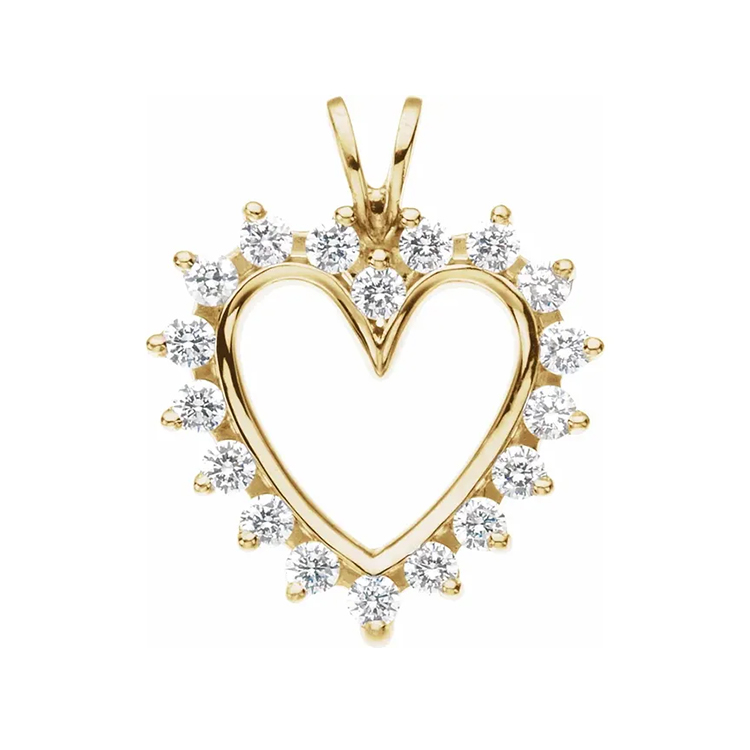60746 / Diamond Heart Pendant. Pendant Dimensions 26 x 21mm. Total Diamond Carat Weight 9/10 CTW. Diamond Clarity I1, Diamond Color G-H. Available in 14k White Gold and 14k Yellow Gold. Chain Passage Dimensions 3.4 x 2.1mm.