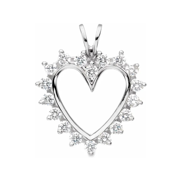 Diamond Heart Pendant. Pendant Dimensions 26 x 21mm. Total Diamond Carat Weight 9/10 CTW. Diamond Clarity I1, Diamond Color G-H. Available in 14k White Gold and 14k Yellow Gold. Chain Passage Dimensions 3.4 x 2.1mm.