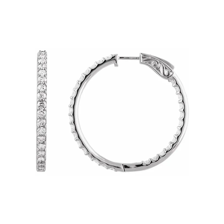 650183 / Lab-grown diamond hoop earrings, (inside-outside style), showcase diamonds along both the front exterior and inner back edges, creating stunning sparkle from every direction. Crafted from sustainable, ethically sourced lab-grown diamonds—identical to natural diamonds in physical, chemical, and optical qualities (Mohs hardness 10)—these earrings provide a bigger, more brilliant appearance at a lower price than mined diamonds.