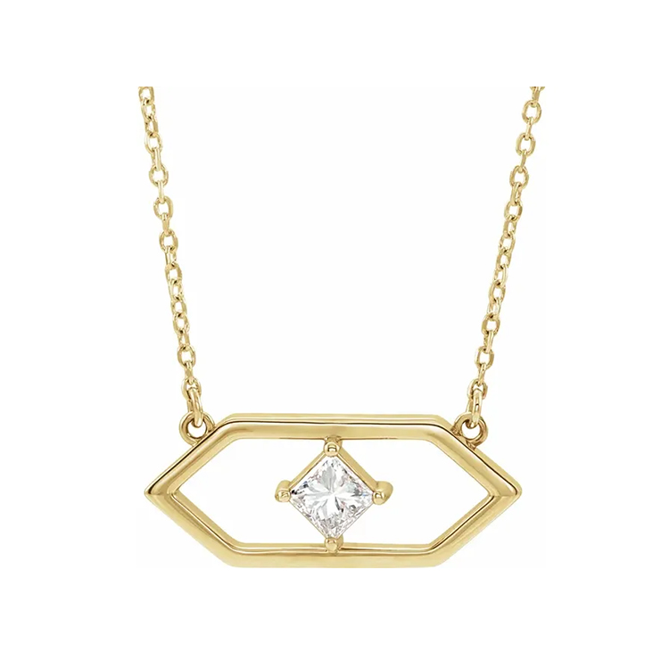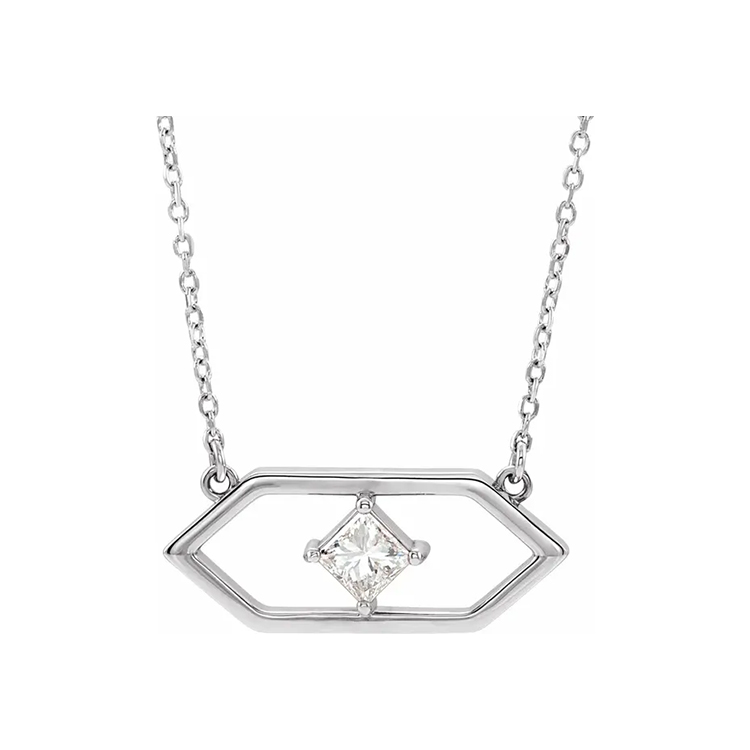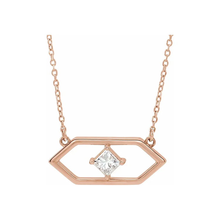 Geometric Diamond Necklace. Pendant Dimensions 20.9 x 8.6mm. Available in 14k Rose Gold, 14k White Gold, 14k Yellow Gold, Platinum and Sterling Silver, 1/4 CTW Natural Diamond. Diamond Clarity I1, Diamond Color GHI. Cable Chain, 1 mm 18″ with Spring Ring Clasp.