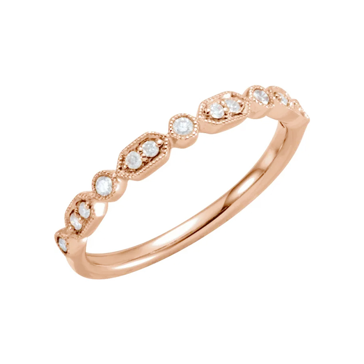 Diamond Stackable Ring. Available in 14k Rose Gold, 14k White Gold, 14k Yellow Gold and Platinum, 1/8 CTW Natural Diamond. Diamond Clarity I1, Diamond Color G-I.