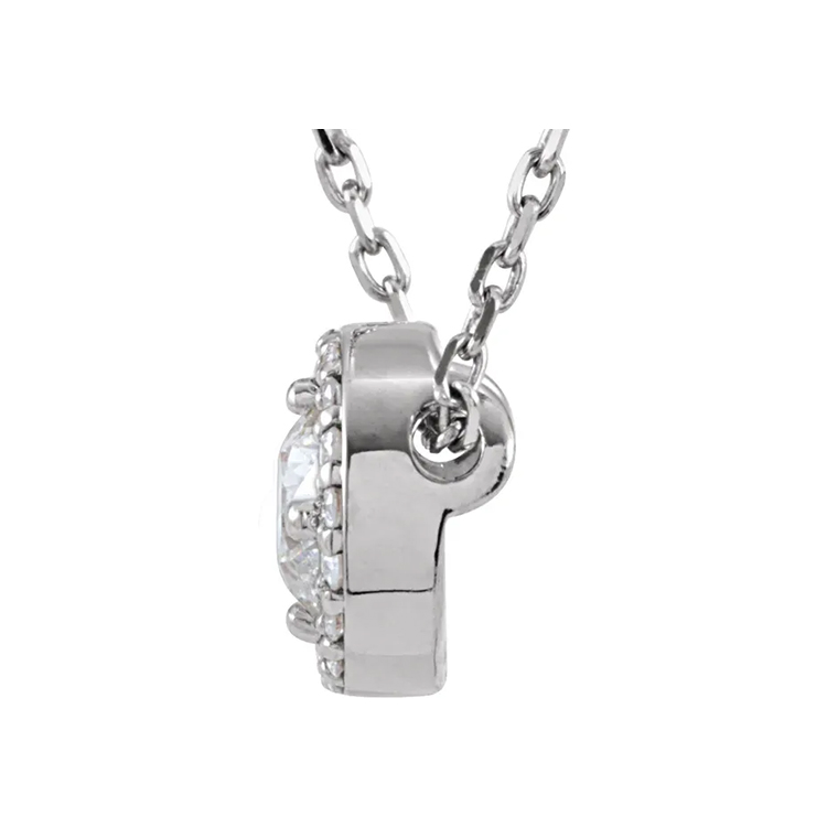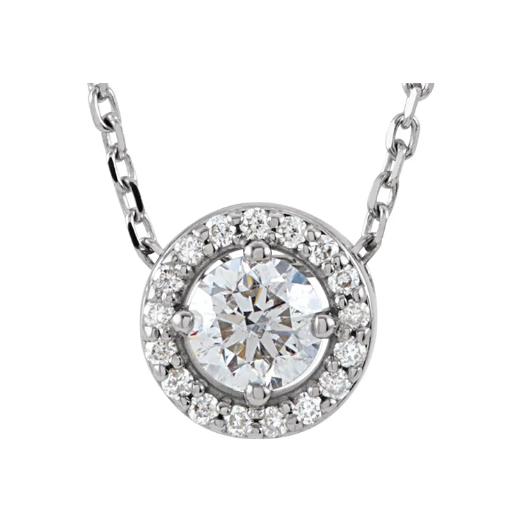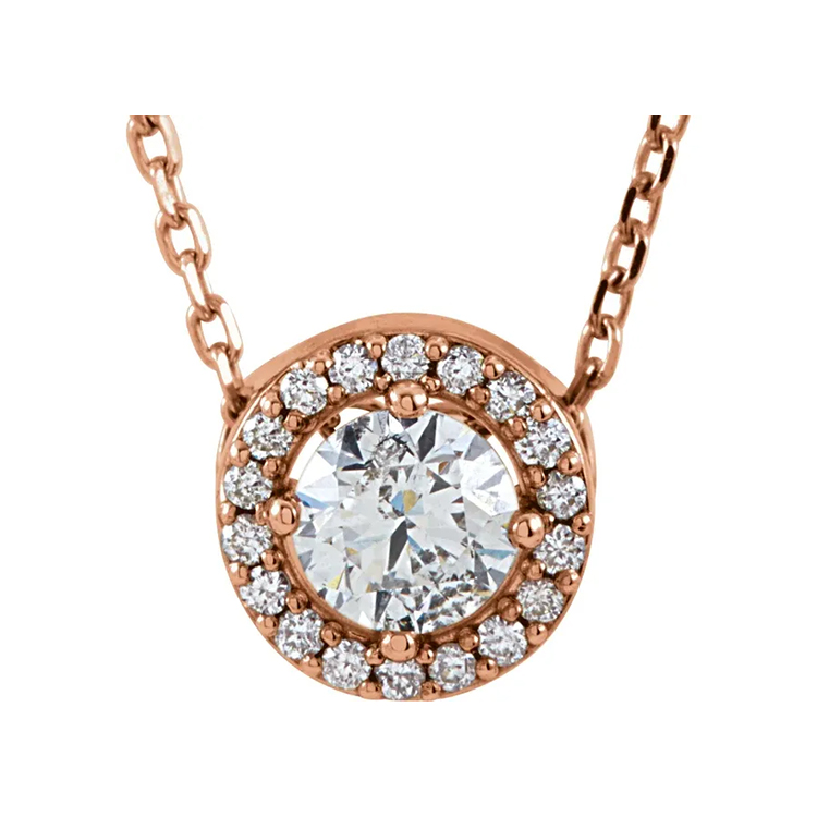 Halo-Style Diamond Pendant available in 14k Rose Gold, White Gold and Yellow Gold. Lab-Grown Diamond, Diamond Clarity SI1-SI2 Diamond Color GH. 16″ Cable Chain, Spring Ring. Dressy