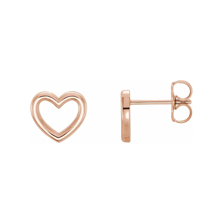 Heart Stud Earrings. Dimensions: 8.7 x 8mm. Available in 14K Rose Gold, 14K White Gold, 14K Yellow Gold, Platinum and Sterling Silver. Friction Backs Included.