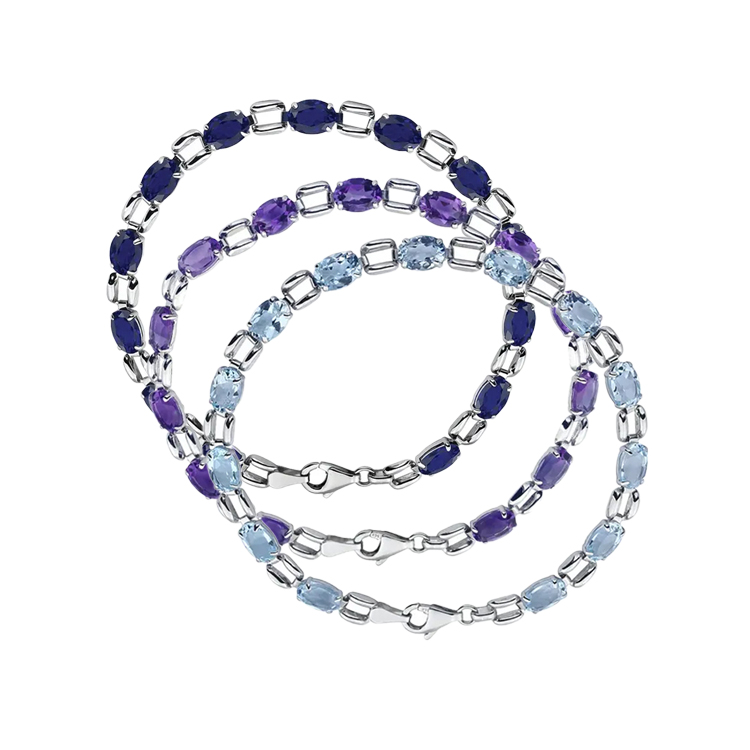 Blue Sapphire, Amethyst, Sky Blue Topaz Line Bracelet . 14K White. 7 x 5mm Oval Shape, Lab-Grown Blue Sapphire, Natural Amethyst or Natural Sky Blue Topaz Stones. Bracelet Size 7 1/4″.