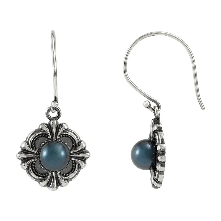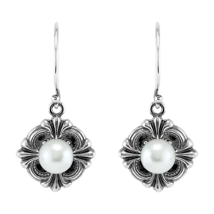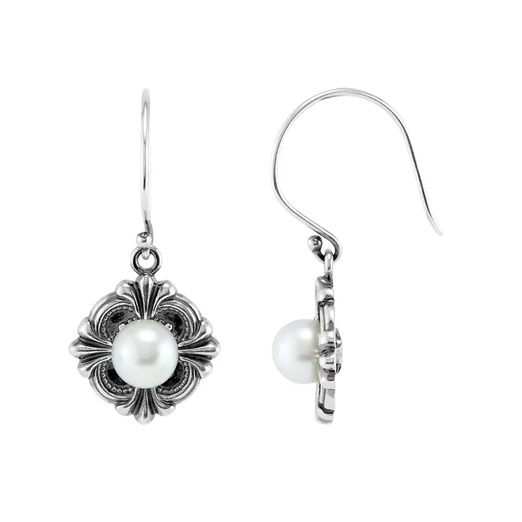 85240 – These Vintage-Inspired Sterling Silver Earrings are 29.2 mm x 14.3 mm with cultured black or white Akoya cultured freshwater pearls approx. 6 mm in size.