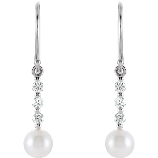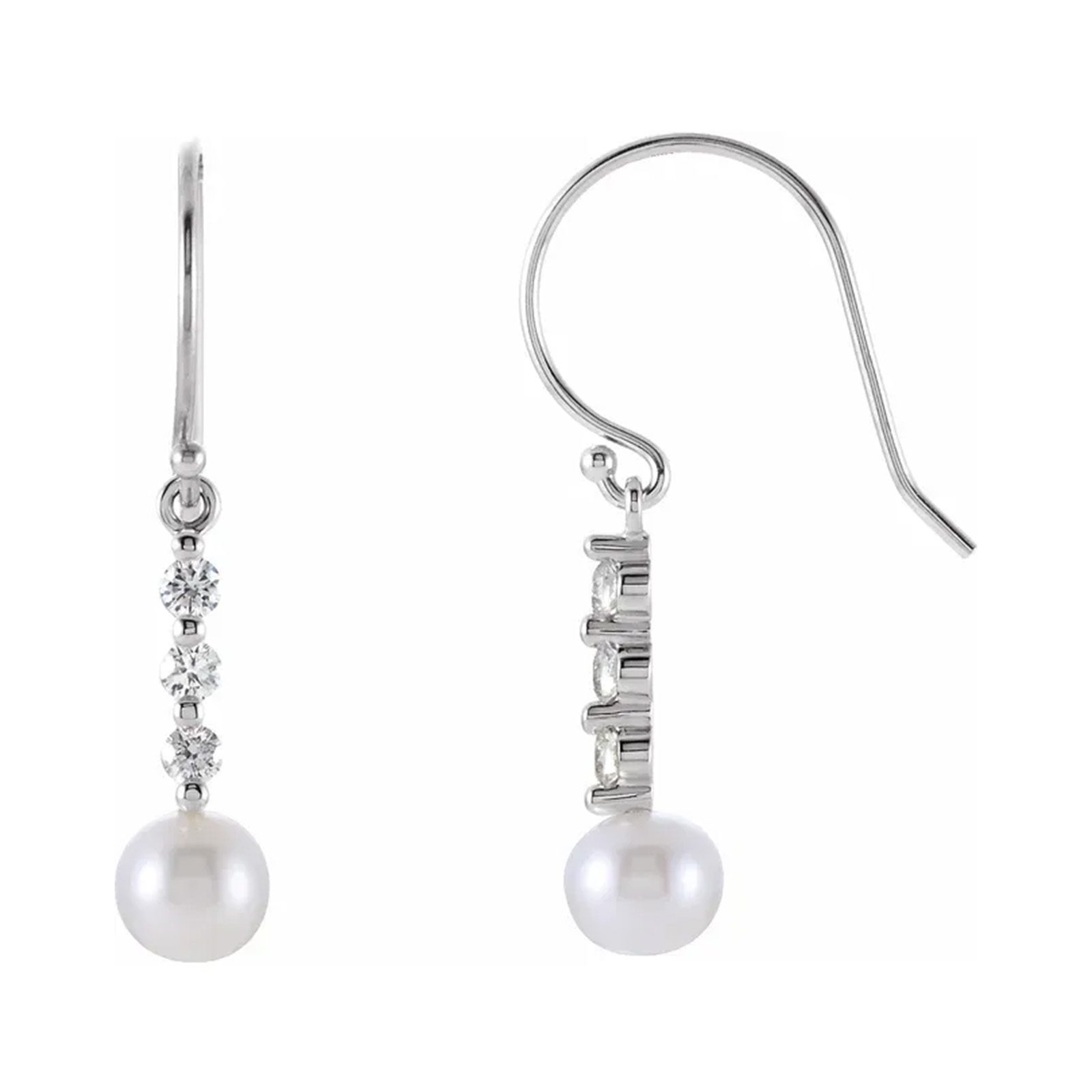 Diamond and Pearl Dangle Earrings. Diamond and Pearl Dangle Earrings. Available in 14k White Gold, Freshwater Cultured Pearl. Pearl Size 5.5-6.0. Total Diamond Carat Weight 1/4 CTW. Formal or Evening Out Earrings.