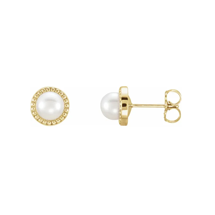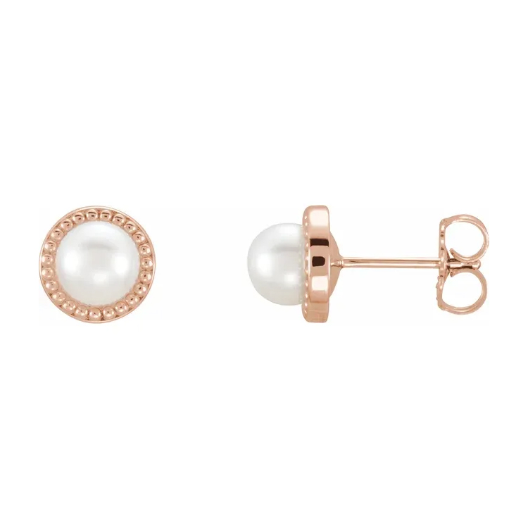 Stud Earrings, White Pearl, Beaded Halo-Style. Available in 14k Rose Gold, 14k White Gold and 14k Yellow Gold. Cultured White Freshwater Size Range 5.5-6.0 mm. Friction Backs Included.